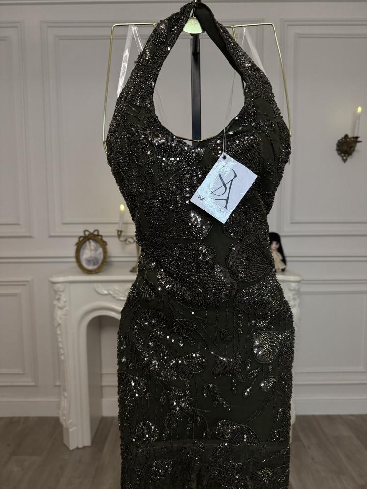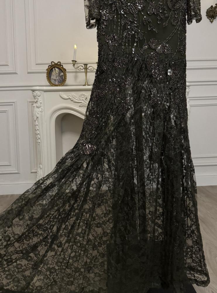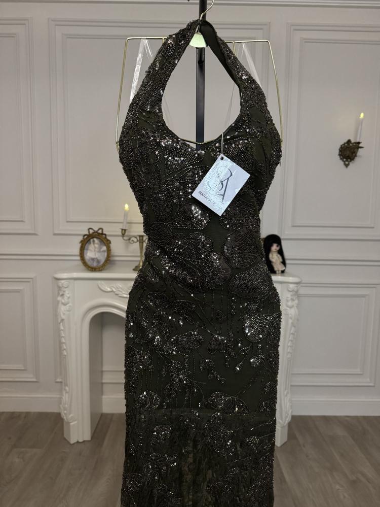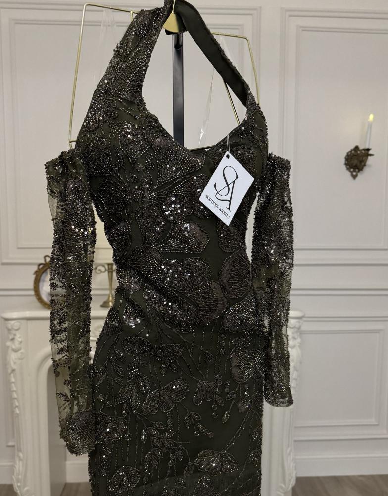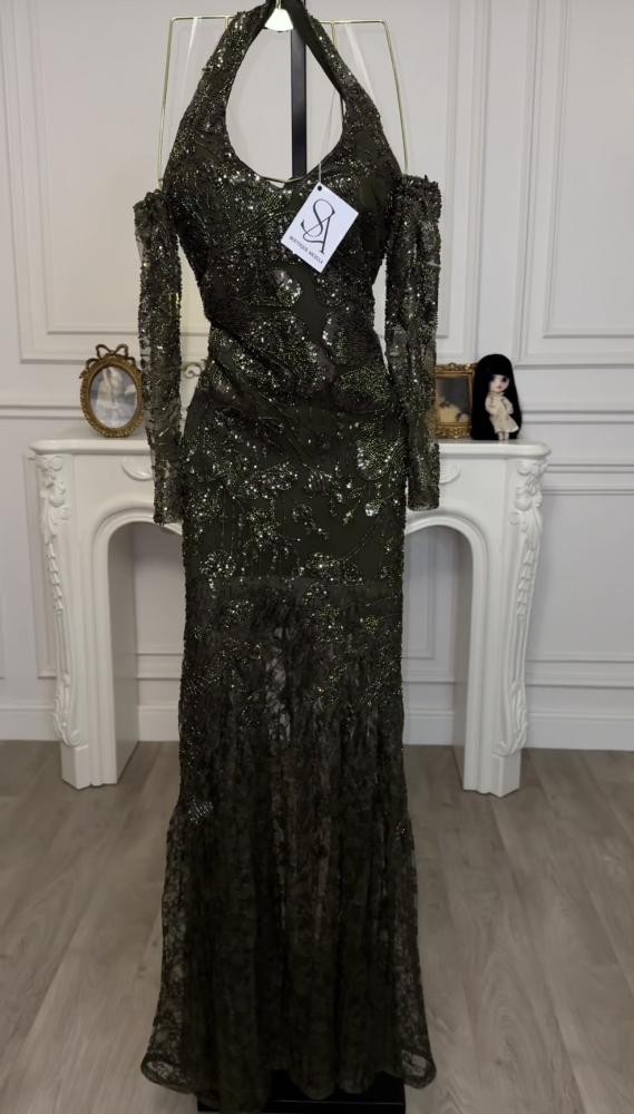 فستان سهرة ملكي فاخر بتصميم أنيق من تول مطرّز يدوياً بالخرز والشك مع لمسات دانتيل بوليسيا تزيده أنوثة ورقي. باللون الزيتي العميق الذي يمنح جاذبية استثنائية ويجعل إطلالتك مثالية للسهرات والمناسبات الفخمة✨.