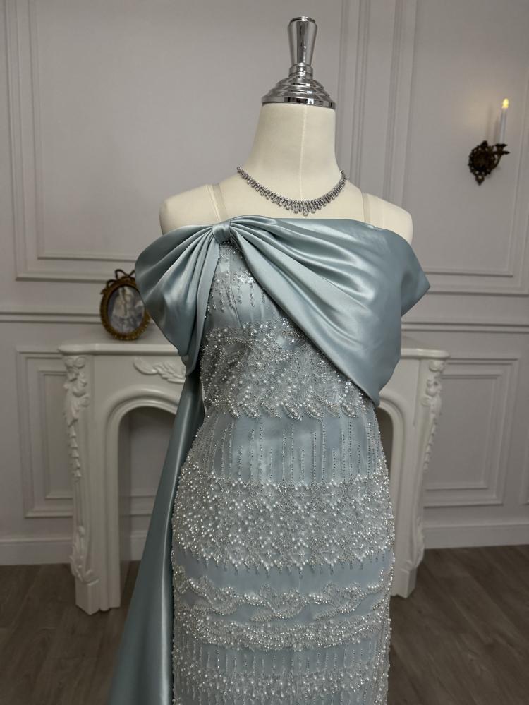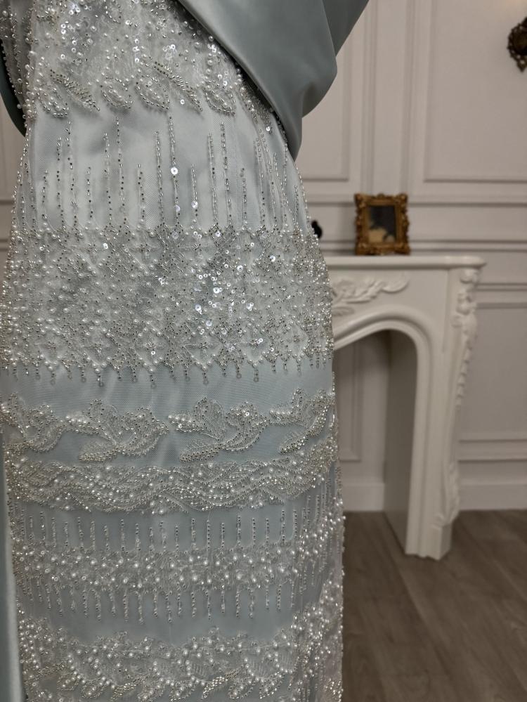 الفستان مصنوع من تفته أمريكي مطفي عالية الجودة، ومزين بـ خرز شك فاخر يضيف لمسة من السحر والرقي.