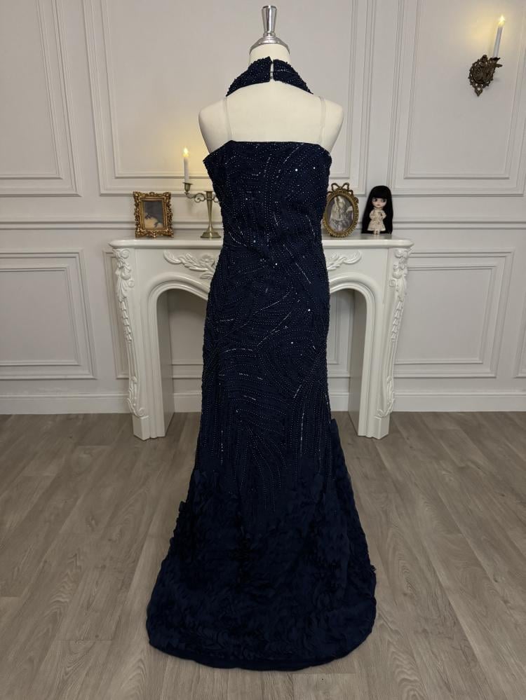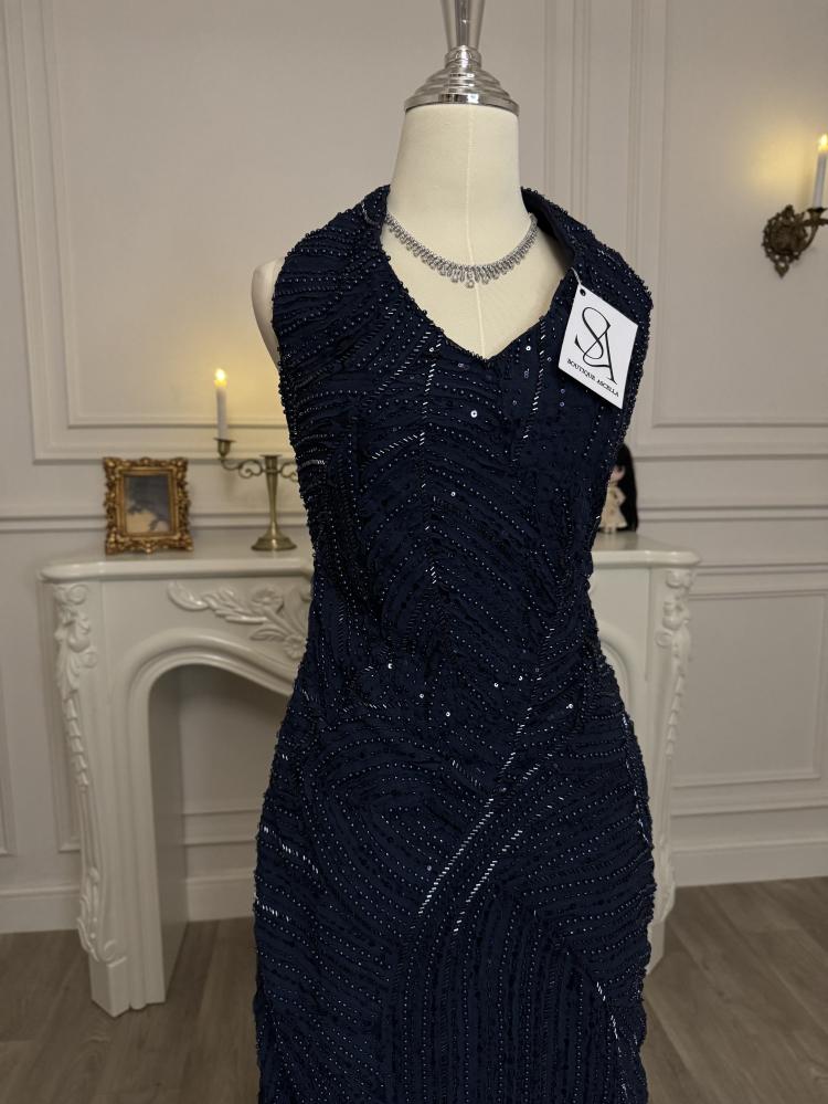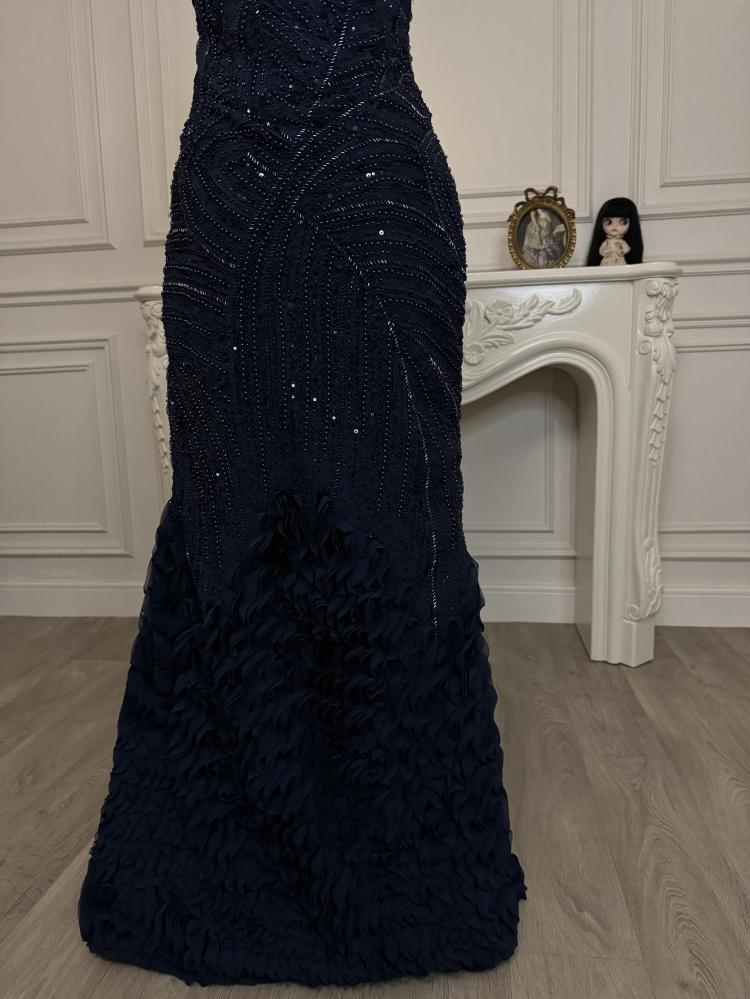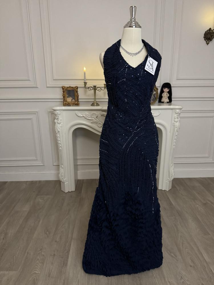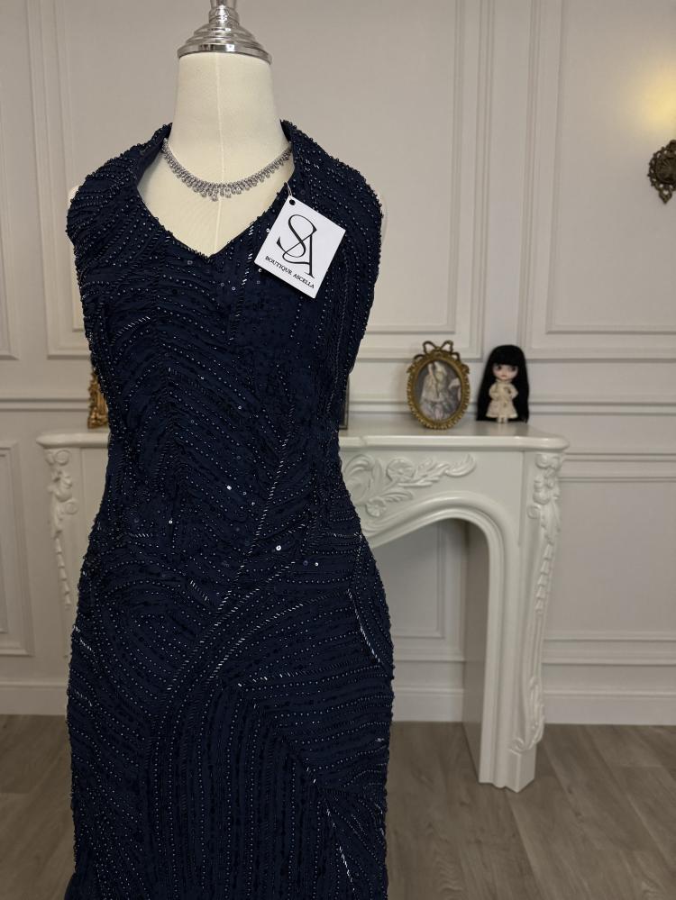 فستان ساحر بلون الكحلي الترندي، ينساب برقي بتصميم سمكة بذيل طويل يمنح إطلالة فخمة. مصنوع من تل ناعم على شيفون مطرّز يدويًا بخرز شك فاخر، مع بطانة باربى تضيف امتلاء وأناقة✨.