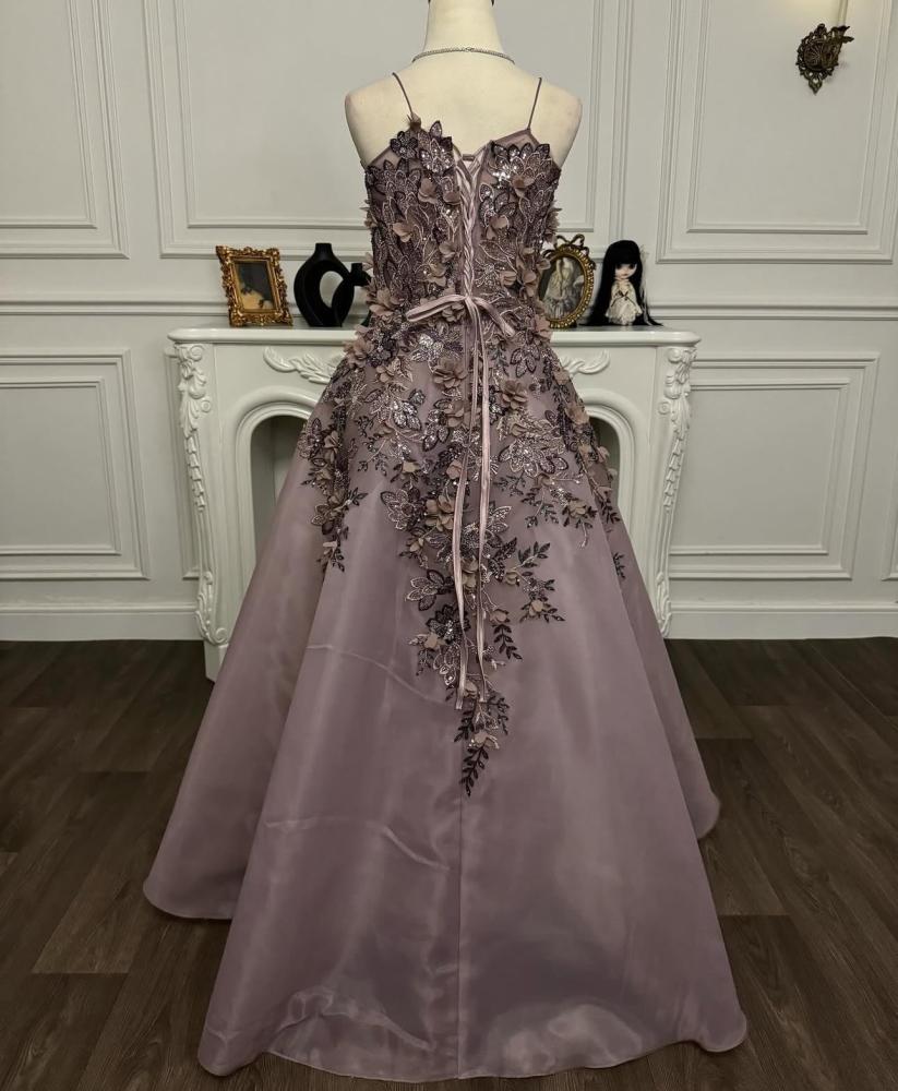 الفستان يظهر بتصميم أنيق ويتميز الجزء العلوي بتفاصيل تطريز غنية باستخدام ألوان فضيه ونحاسية مع أشكال زهور وأوراق، مما يضفي لمسة فخامة. التنورة طويلة وواسعة بقصة الأميرات مما يمنح الفستان مظهراً كلاسيكياً وأنيقاً. التصميم يتناغم بين الفخامة والبساطة، ما يجعله مثالياً للمناسبات الراقية