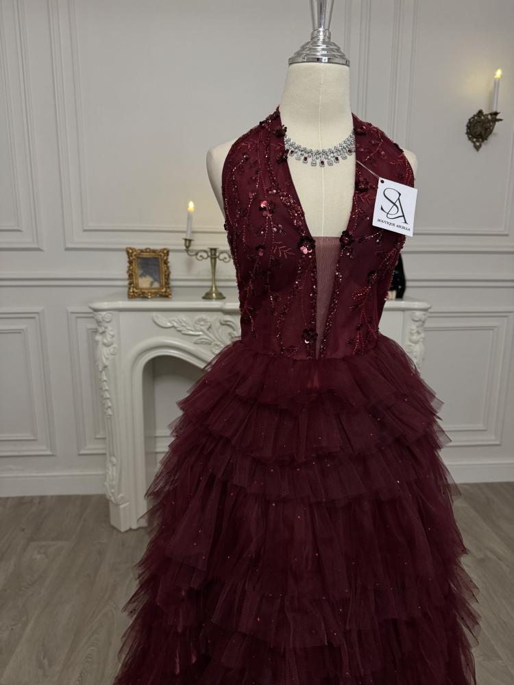 - التصميم العلوي: قصة هالتر برقبة مفتوحة مع فتحة صدر على شكل V عميقة، مرصعة بتطريز يدوي لامع من الخرز والباييت يضفي لمسة براقة.