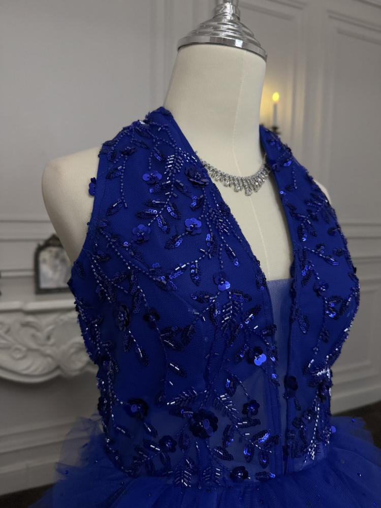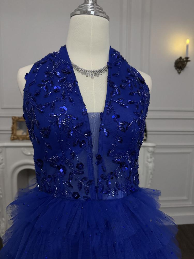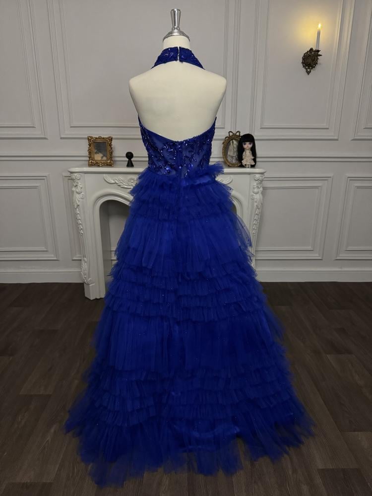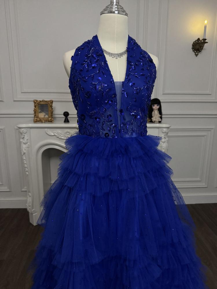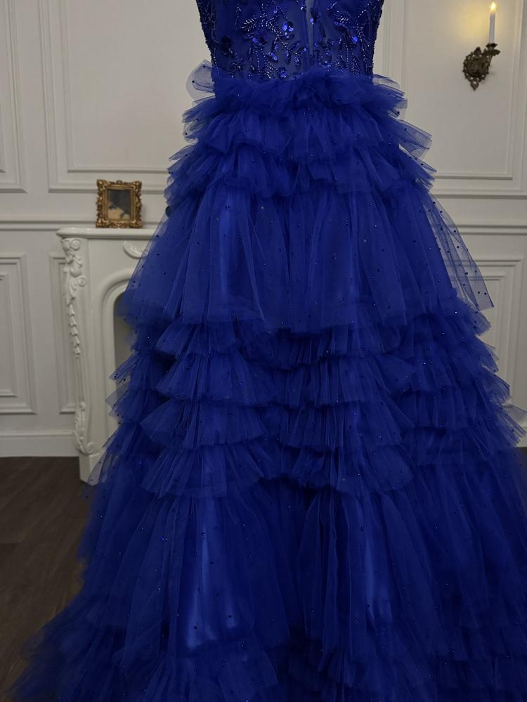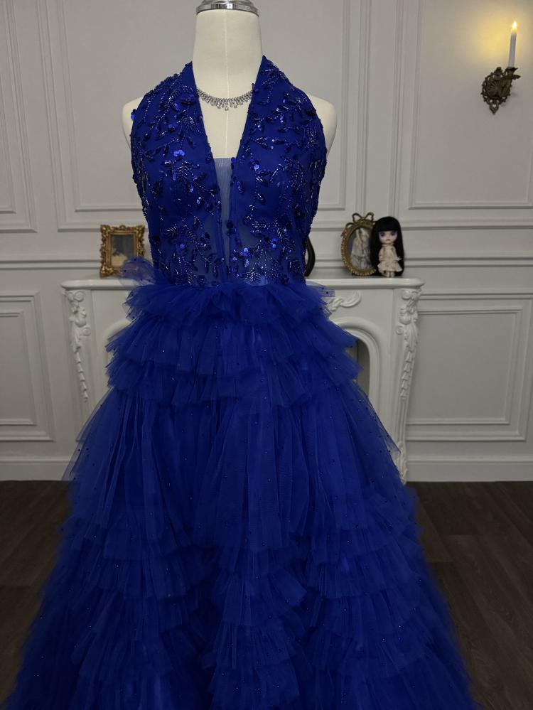 فستان بتصميم طبقات من قماش شبكي مطرز بفصوص ليزر، صدر مطرز بالخرز وظهر مكشوف يضفي لمسة أنثوية راقية.