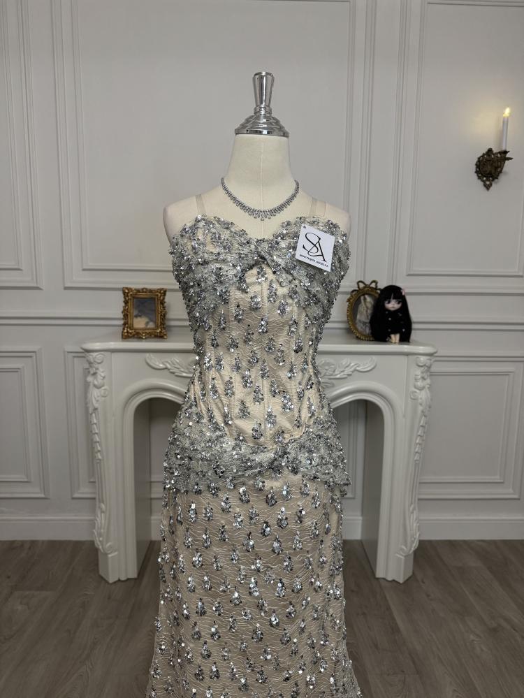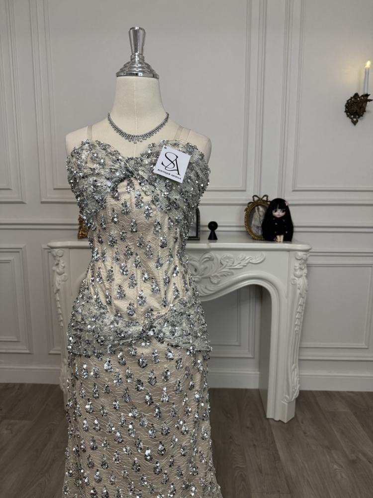 • القصة: مصمم بقصة ضيّقة مستقيمة تبرز قوام أنثوي أنيق، مع كورسيه صدر على شكل قلب (Sweetheart) يضفي لمسة رومانسية فاخرة.