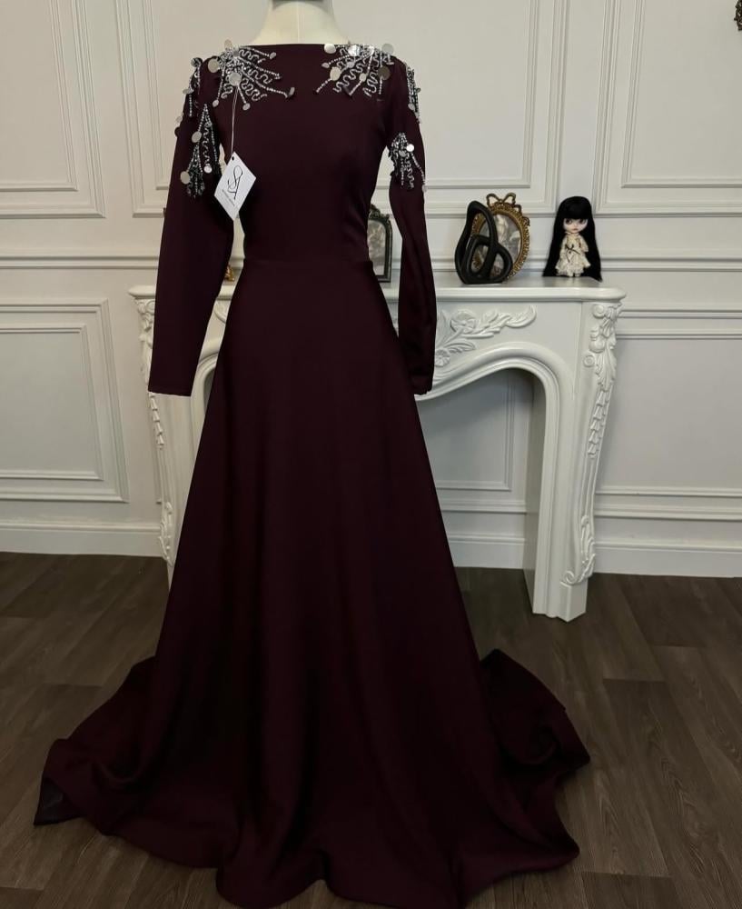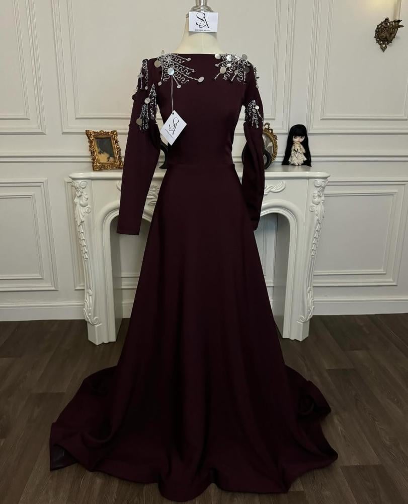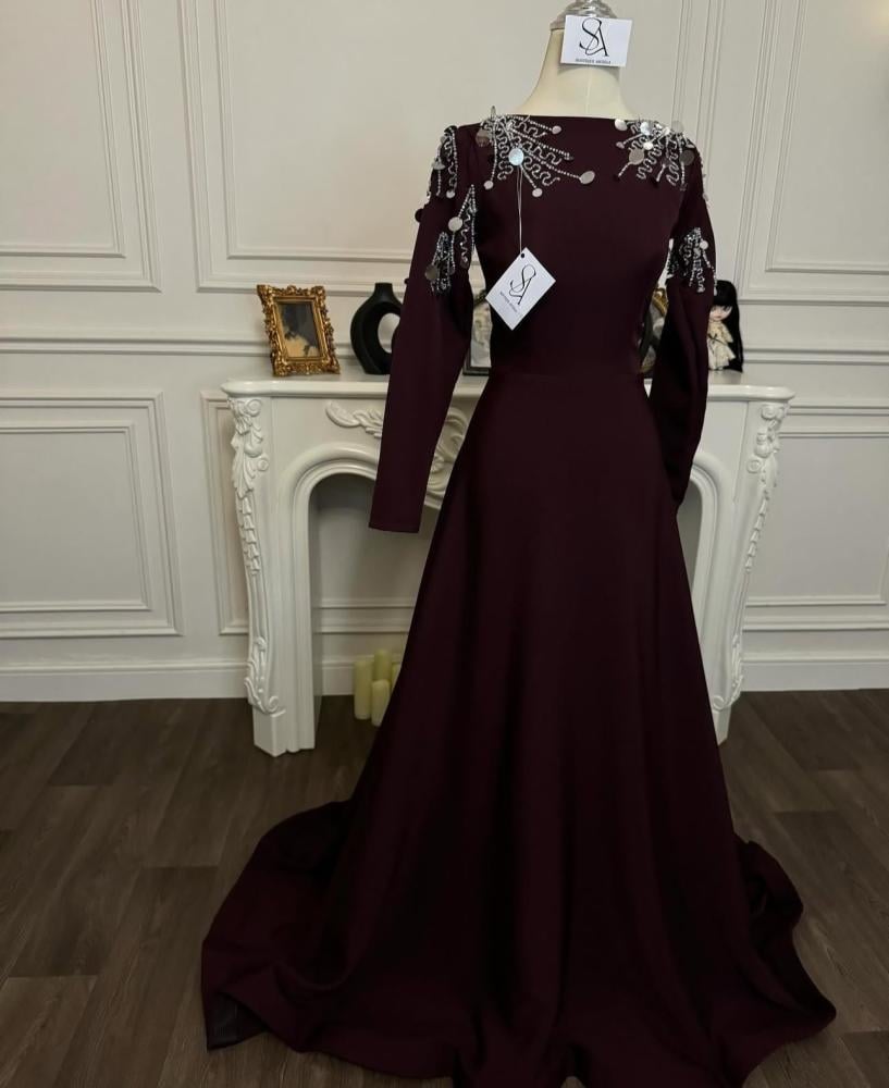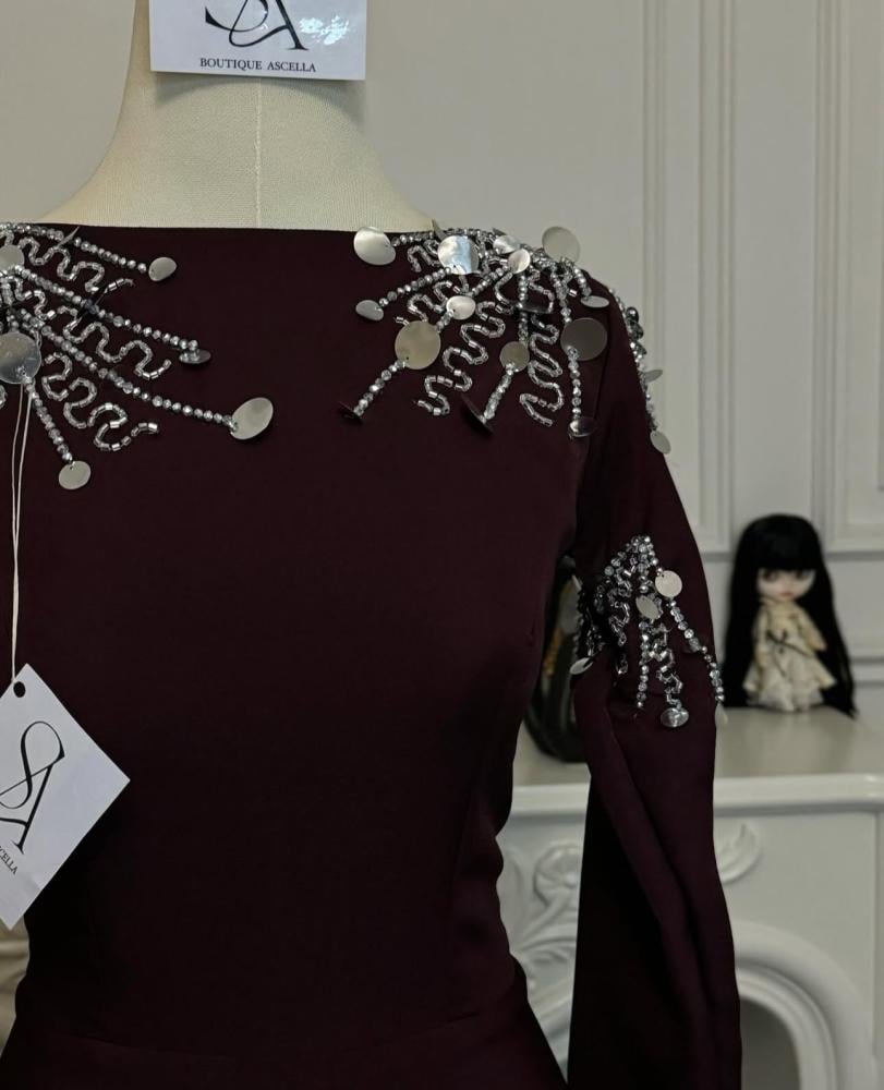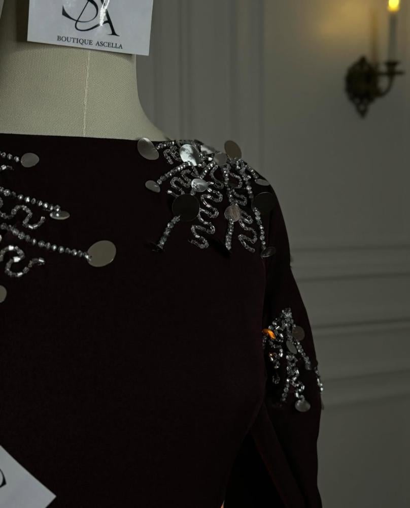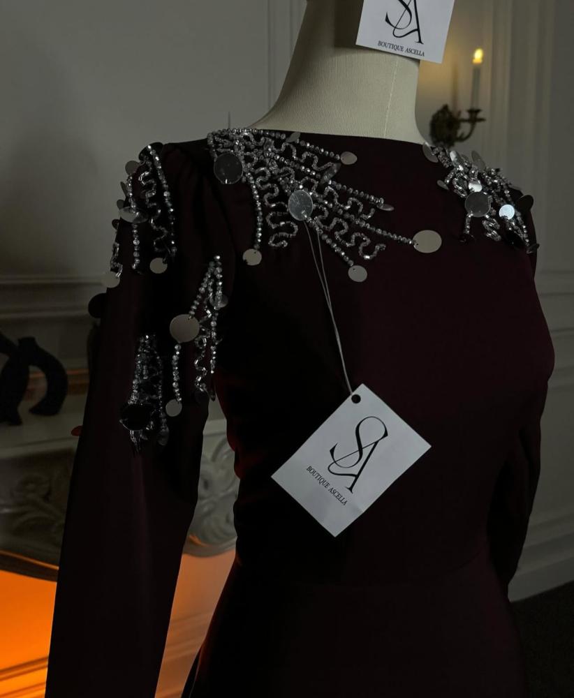 احصلي على فستان ميعاد بتصميم كلاسيك بلون عودي غامق يجعل الانظار عليك طوال السهره . يتميز هذا الفستان بقصة كلوش تضفي لمسة من الأنوثة والجاذبية. مصنوع من قماش باربي بتطريز شك يدوي يمنحه مظهرا جذابا وملفت